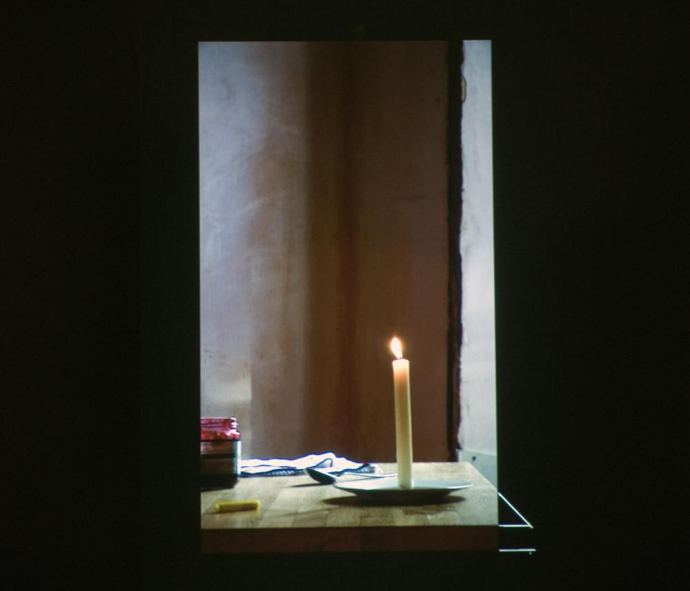 The Super 8 documentation of Chris Burden’s seminal concrete performance piece Bed Piece (1972) is a cornerstone of the Votive exhibition. He described some of the underlying motivations of his early performances by explaining, ‘…there are considerations like the myth and the reality, fantasizing something and having it be real – the early pieces were apparitions.’ Apparition can be interpreted in two interconnected senses – a ghost or ghostlike image of a person, and the appearance of something remarkable or unexpected. The word derives from ‘the action of appearing’. This idea of the action of appearing is significant in thinking about all of the works selected for inclusion in this exhibition. The ghostlike quality of the documentation of Burden’s work is also present in Torsten Lauschmann’s film installation Dead Man’s Switch (2008), which depicts a single candle burning on the kitchen table in the artist’s home. This vision of almost stillness elides the temporary and ephemeral nature of the live event, to fix the flame in an eternal present. The phased action of appearing is converted into the plenitude of the appearance itself, stripped of both preamble and aftermath.
