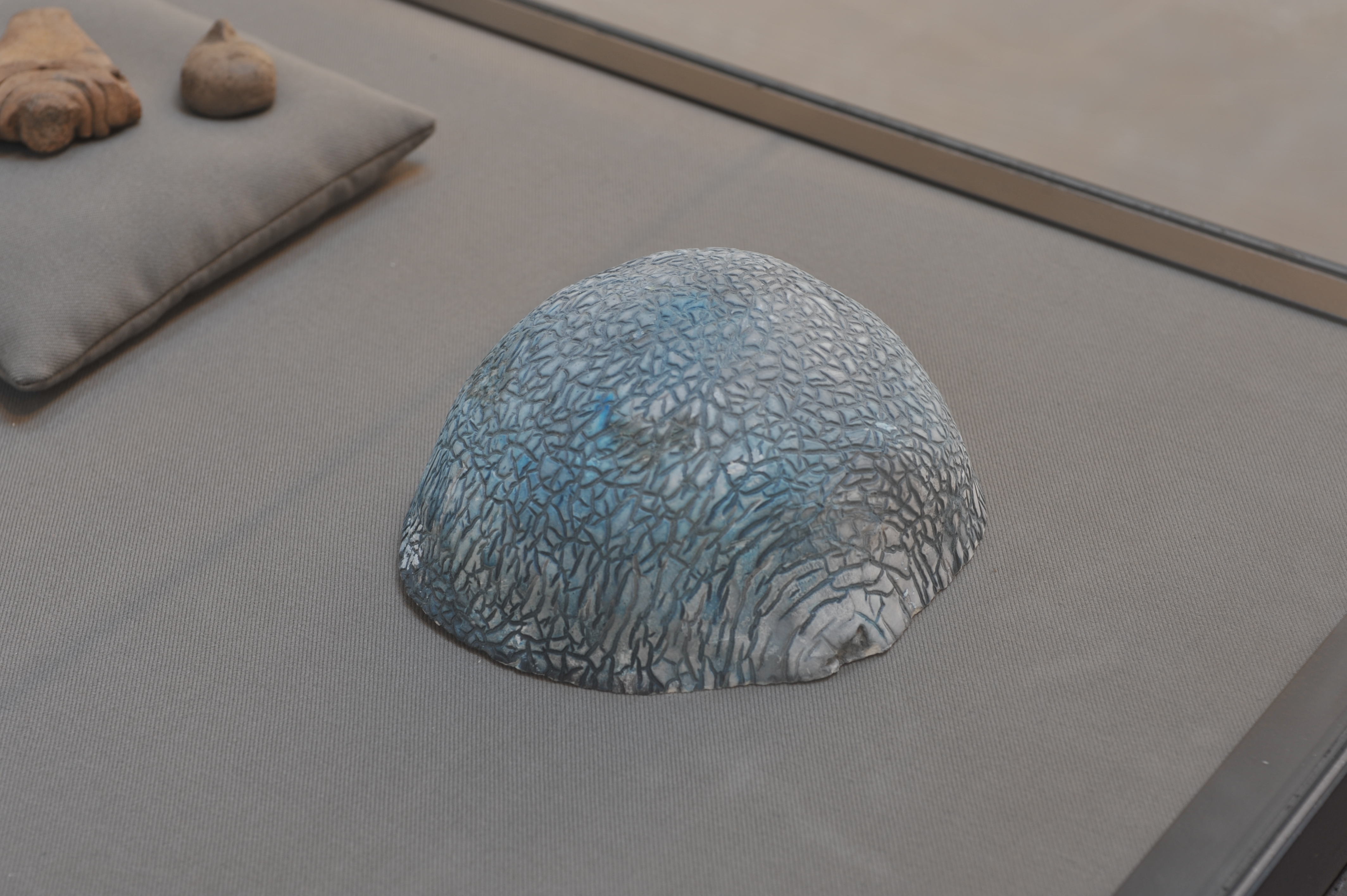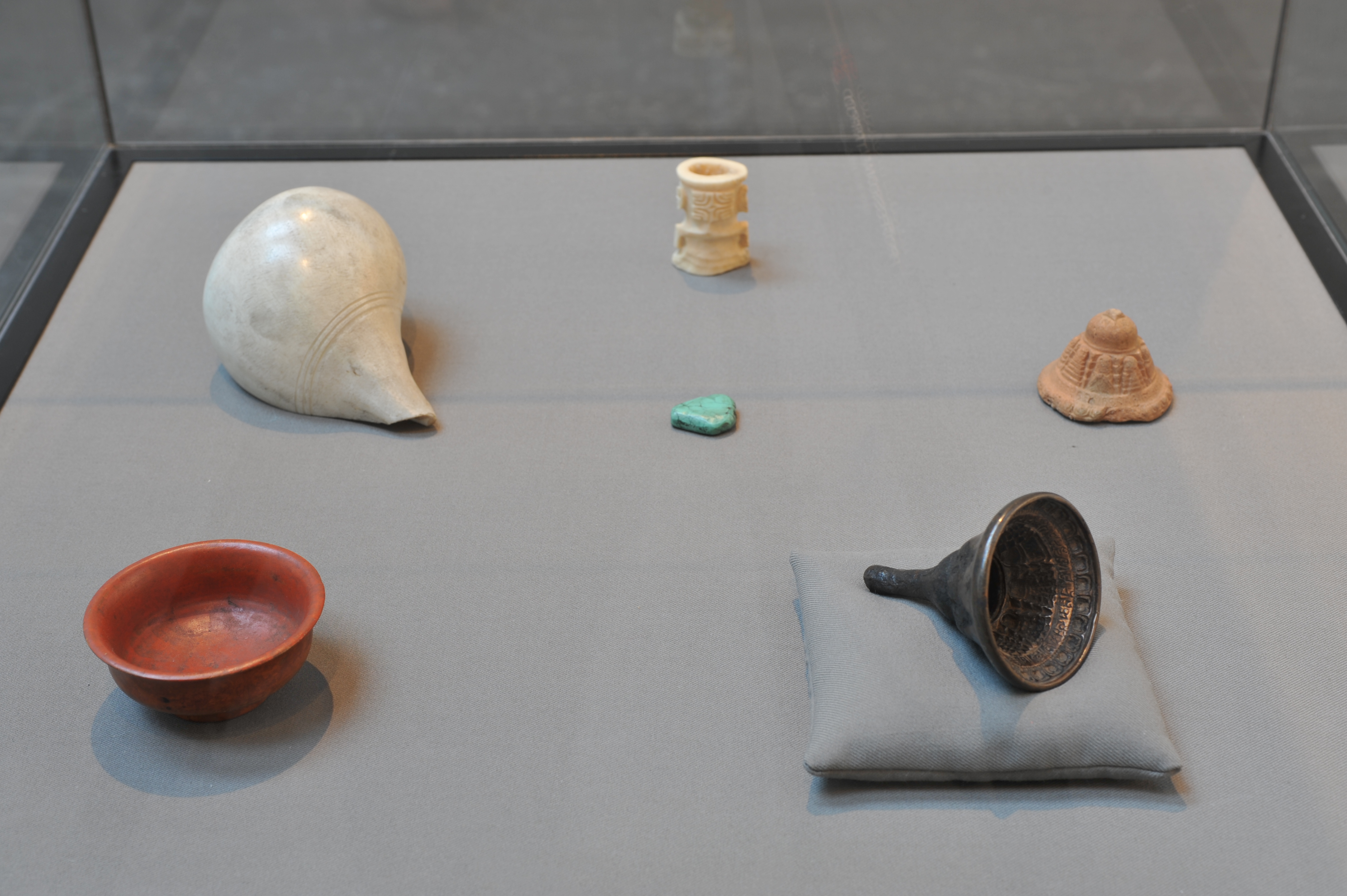 Glasgow Museums have generously loaned twelve objects from their world-renowned World Cultures Collection to the Votive exhibition. In many of these objects, the natural world and the poetic world co-exist: as for example in the turquoise bead, used in decorating headdresses, from a collection of ethnographical objects from Tibet which, for traders in salt of the Himalayan region, had an amuletic function, in averting sickness on journeys. Similarly, the trumpet conch-shell, from Tibet, used in worship along with cymbols and also placed on altars is a natural form that has a symbolic, cultural meaning and function. The other objects selected are man-made, but similar to the turquoise bead and the shell trumpet, their use or significance may not be immediately apparent to the observer. Several of the objects possess a duality, being both functional objects and also possessing symbolic meaning, for example the wooden bowl, with red interior, used for tea and food, from Tibet, which was used by pilgrims both for ordinary meals and for making offerings, and the holy water bowl, made in Lhassa, from a collection of ethnographical objects from Tibet, which perform both a practical and a ritualistic function, both containing water and symbolizing the cycle of life. Similarly, the bone figure used by the natives for tightening the skins on their drums, from a collection of ethnological specimens from the Marquesas, South Pacific, is not only a musical tool but also a fetish.