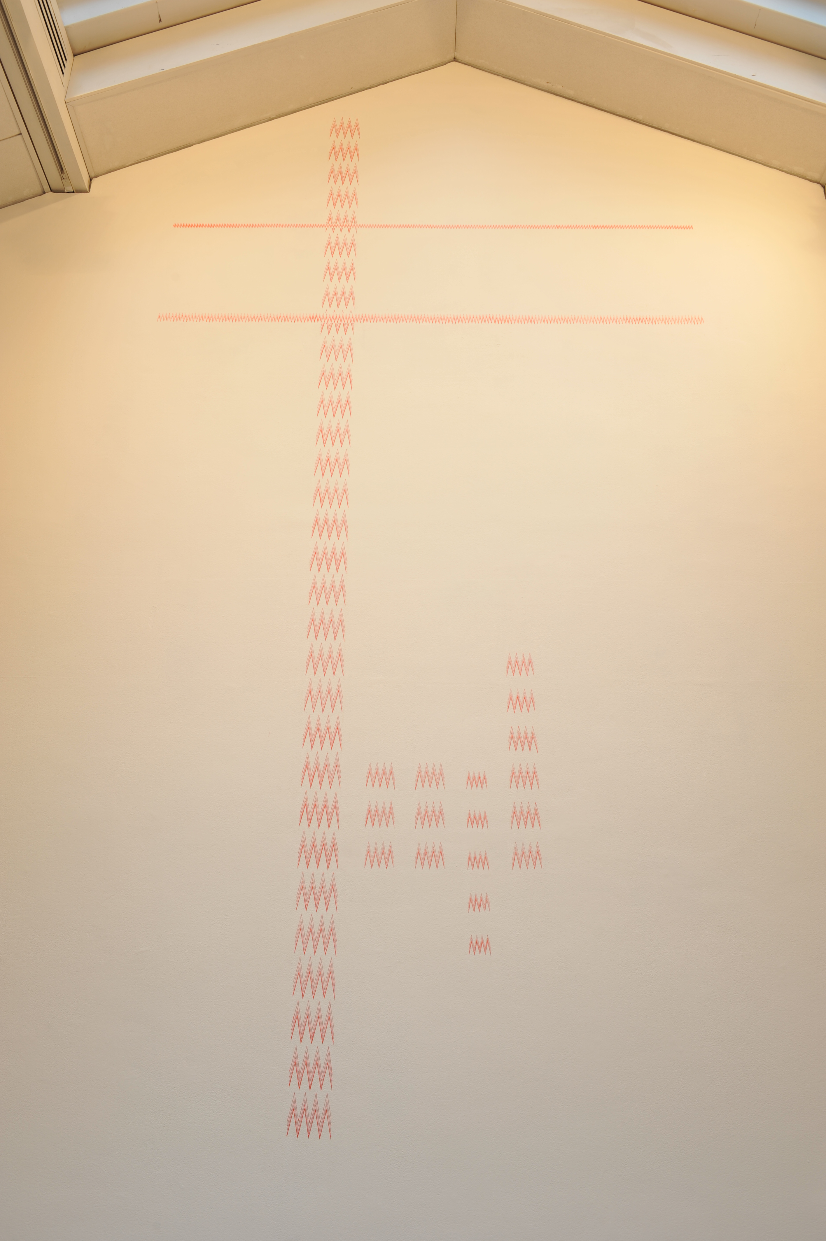 Looking back from Brecht towards what is convincingly the apse, the delicately unnerving wall drawing of Wright comes into its own. Wave-like patterns in red gouache are spread up the height of the architecture and perpendicularly to that axis. The wall work is engagingly hard to account for: might this formation be cruciform, or is the aesthetic that of a cardiograph?