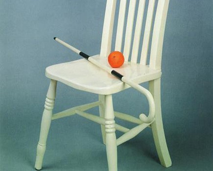George Brecht, Chair Event (1969).This important and rarely seen sculpture consists of a whitewashed chair, on the seat of which are placed a walking stick painted with black and white stripes and an orange. Brecht’s work demonstrates the possibility of sculpture as a prompt to action, whether actual interaction with the objects (as was the case in the early years of his work) or the imaginary acts his work now inspires in spectators. He once described his art as a way of ‘ensuring that the details of everyday life, the random constellations of objects that surround us, stop going unnoticed.’