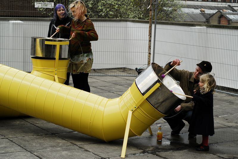 The four artists selected to participate in this group collaborative exhibition project, Chris Johanson (USA), Camilla Løw (Norway), Mary Redmond (UK) and Corin Sworn (Canada/UK), made sculptural works designed to be played with by both children and adults in an outdoor environment.