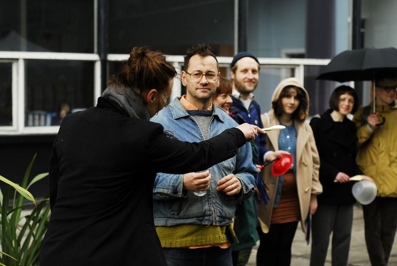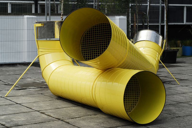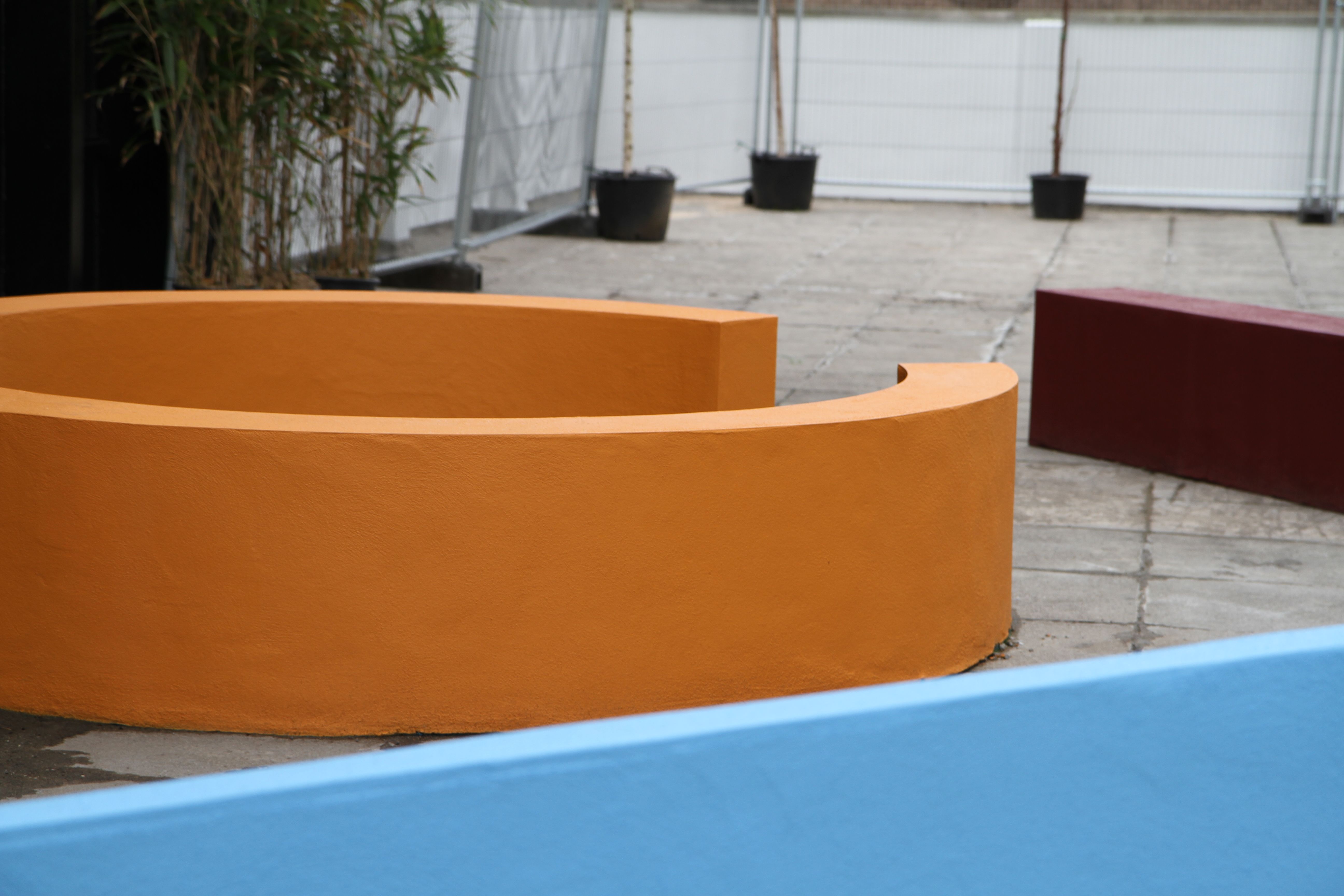 Dialogue of Hands was an outdoor sculpture park for children and adults, located on the open air elevated East Gymnasium of the iconic 1964 building, formerly known as the College of Building and Printing (recently renamed City of Glasgow College). The exhibition was an immersive sensory environment, with an emphasis on real time audience participation and attracting families with children. The courtyard, which despite its city centre location, was hidden from view and previously unused, was landscaped in homage to the 1960s environments of Brazilian artist Helio Oiticica, using willow trees, flowering cherry trees, birch trees and sensory herbs (lavender and rosemary) and play carpeting in homage to Oiticica’s seminal participation project Eden (Whitechapel Gallery, London, 1969). The exhibition also referenced Palle Nielsen’s famous Model for a Qualitative Society (Moderna Museet, Stockholm, 1968) which similarly explored the boundaries between art/play, control/freedom and adulthood/childhood.